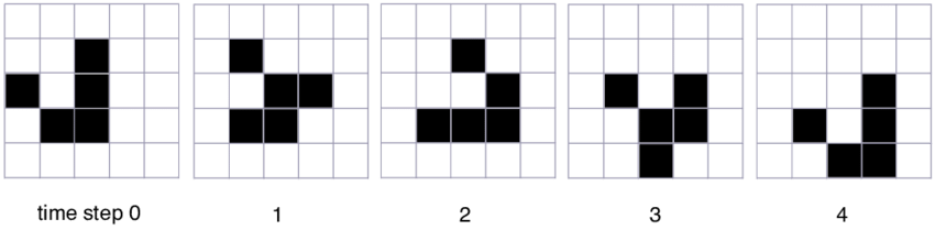 A glider is made up of the pattern below, it travels one square diagonally every 4 ticks.